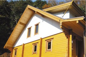 ▲翼住宅の2×6・ログハウスの玄関ドア・サッシをご提供頂いています